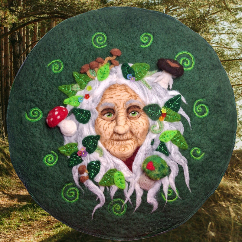 Diese Alte schaut dich mit ihren tiefgründigen, klaren Augen an, die von ihrer Weisheit und Erfahrung zeugen. Spürst du ihre Liebe, zu allem was uns umgibt? Das Gesicht, die Blätter und Pilze schauen dreidimensional aus dem Bild.